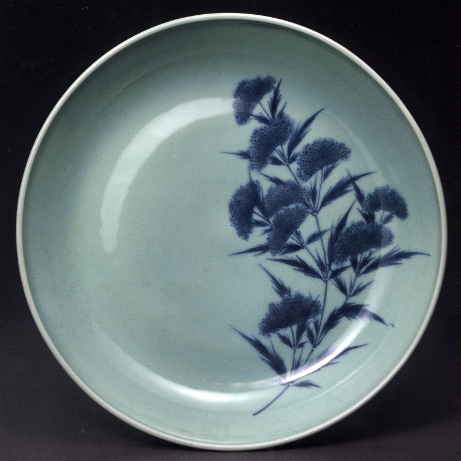 蓋し青磁染付の傑作中の傑作であるといいたい。これは尺皿に女郎花の一枝に小花が傘状に咲いた風情を描いたもので、枯淡の中に新鮮さがありいうべからざる滋味を放散している。これは数ある青磁染付の中で不滅の大作である。