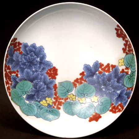 美しいといえばこれ程美しい見事な皿は鍋島といえども極めて少ない。特に濃淡な染付の微妙な味には気高い気品があり、その染付の間を縫って、赤、黄、緑の水草を織り交ぜてその色の醸し出す効果は、優雅な貴族趣味の魅力を余すところなく表現している。あまりにも色彩が美しいため、元禄以前のものに見るような、こくのある力強いものは感じられないが、芸境の高さを示す代表的作品である。