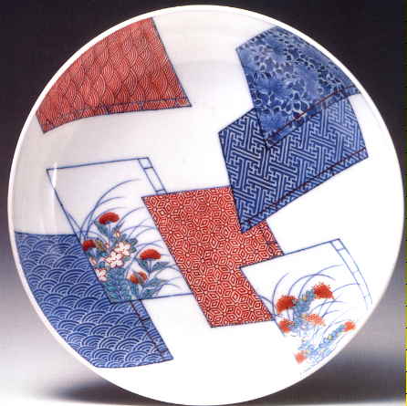 赤の青海波に対し、染付を配するなど心にくい変化を与え藩窯陶工の非凡と細心な技巧を示している。