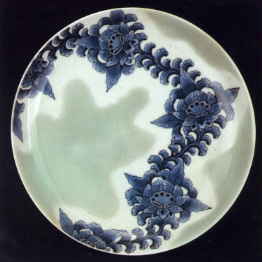 これは思いきった表現である。オランダ風な唐花模様を染付で大胆に強く濃く描き、この間を縫うように青磁釉が流れている。