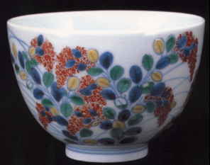 薔薇図茶碗は口縁がやや反っているが、これは胴に脹らみをもたせながら立ち上がっている。両面に描かれた萩はさすがに見事で葉は染付、緑、黄と交互に調和を保ちながら色彩芸術の枠を高度に発散している。